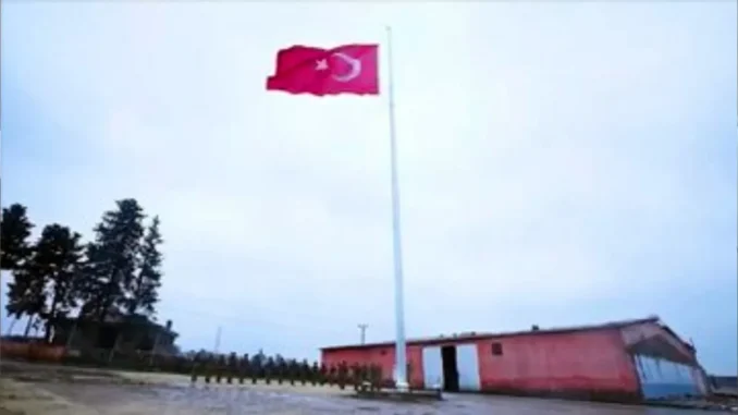 Suriye’nin Kamışlı kentinin Türkiye’ye en yakın noktası olan alana, gerekli tedbirlerin alınmasının akabinde, 30 metre uzunluğunda bir bayrak direği yerleştirildi ve dev Türk bayrağı göndere çekildi.